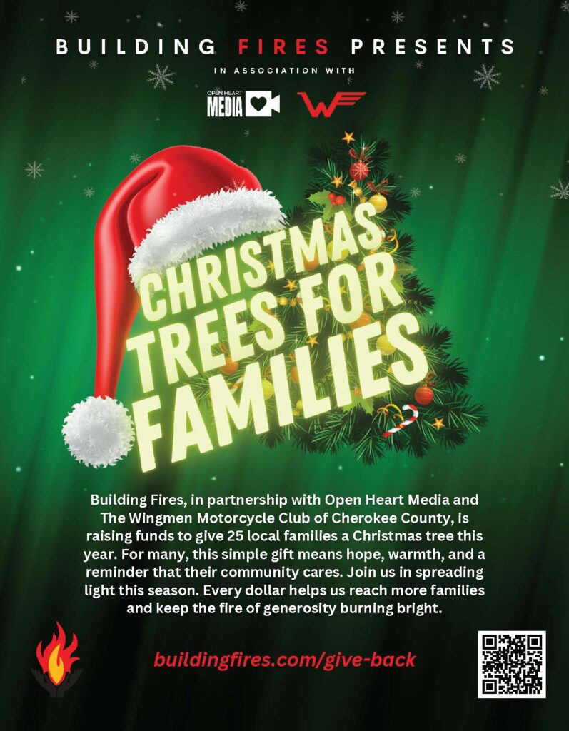 Building Fires, in partnership with Open Heart Media and The Wingmen Motorcycle Club of Cherokee County, is raising funds to give 25 local families a Christmas tree this year. For many, this simple gift means hope, warmth, and a reminder that their community cares. Join us in spreading light this season. Every dollar helps us reach more families and keep the fire of generosity burning bright.